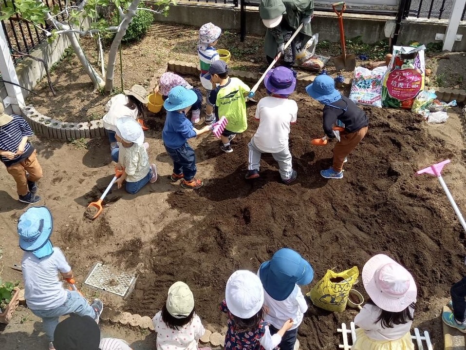 先生から「柔らかい土だと野菜が美味しく育つんだよ!」と聞いた子どもたちも、おもちゃのスコップなどを使って、一緒に畑を掘って柔らかくしていきました。